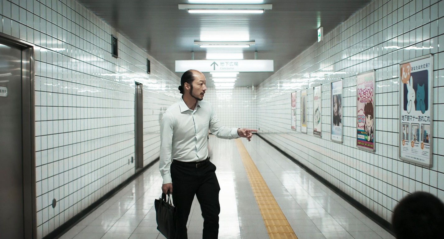 Попробуем разобраться, за счёт чего, какими художественными средствами режиссёр добивается мощного напряжения. Поклонники оригинальной игры The Exit 8, выпущенной компанией Kotake Create, с первых секунд предвкушают драматическую ситуацию – ждут, когда герой завернёт в злополучный переход. Однако начинается действие в переполненном вагоне метро, причём мы видим происходящее глазами протагониста. Потенциал «субъективной» камеры пока изучен слабовато (в том числе в части имитации эффекта «онлайн»), но среди прочего приём вызывает у посетителя кинозала странное, некомфортное ощущение – ощущение резкой ограниченности пространства. Как будто взираешь на окружающий мир из коробки (подобно «человеку-ящику» из одноимённого романа Кобо Абэ)… И если, скажем, на сеансе боевика «Хардкор» /2015/ это быстро надоедает, то в «Выходе 8» – работает на раскрытие основной идеи. Готовит публику к обстановке, воспринимаемой не иначе как кошмаром клаустрофоба. К слову, здесь же Кавамура и Кэнтаро Хирасэ задают важный мотив: персонажу крайне не вовремя звонит избранница с новостью о том, что находится в больнице, где узнала о своей беременности. Реакцию мужчины «радостной» не назовёшь!