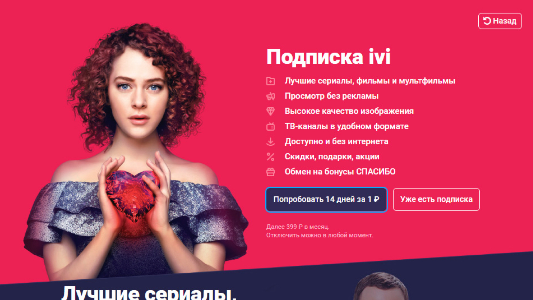 Подписка Иви — это решение для тех, кто любит смотреть кино и не любит переплачивать. Всего за 399 рублей в месяц вы получаете доступ к тысячам фильмов и сериалов, в том числе к эксклюзивам. Вы сможете подключить до 5 устройств (компьютеров, смартфонов или телевизоров) и пользоваться ими одновременно.