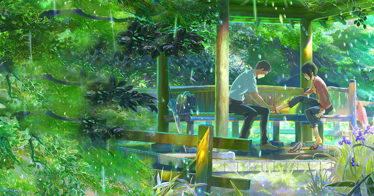 Главный герой Такао отправляется своим обычным маршрутом в старшую школу и по пути прячется от дождя в беседке, где делает наброски для обуви, так как мечтает посвятить свою жизнь ее изготовлению. В беседке он также замечает молодую девушку, которая пьет пиво, заедая его шоколадом. Они начинают разговаривать, и он спрашивает, не встречались ли они раньше, так как Такао кажется, что он ее знает. Девушка говорит, что они не знакомы, после чего зачитывает ему стих и уходит.